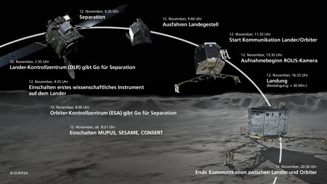Um 9.35 Uhr sollte die Rosetta-Sonde, gesteuert vom Kontrollzentrum der ESA, auf ihrer Bahn den Punkt erreichen, an dem Philae ausgestoßen wird. Sieben Stunden lang wird Philae dann im Schritttempo in Richtung Kometenoberfläche sinken. Um 9.44 Uhr soll dann das Landegestell ausgefahren werden. Das Team im Lander Control Center (LCC) des DLR wird dies genau überwachen, denn sollte Philae nicht wie geplant den Ablauf einhalten, müsste der Lander neue Steuerkommandos erhalten. Ab 11.35 Uhr beginnt die Kommunikationsverbindung zwischen Philae und dem DLR-Kontrollraum, aus dem der Lander gesteuert und betrieben wird.